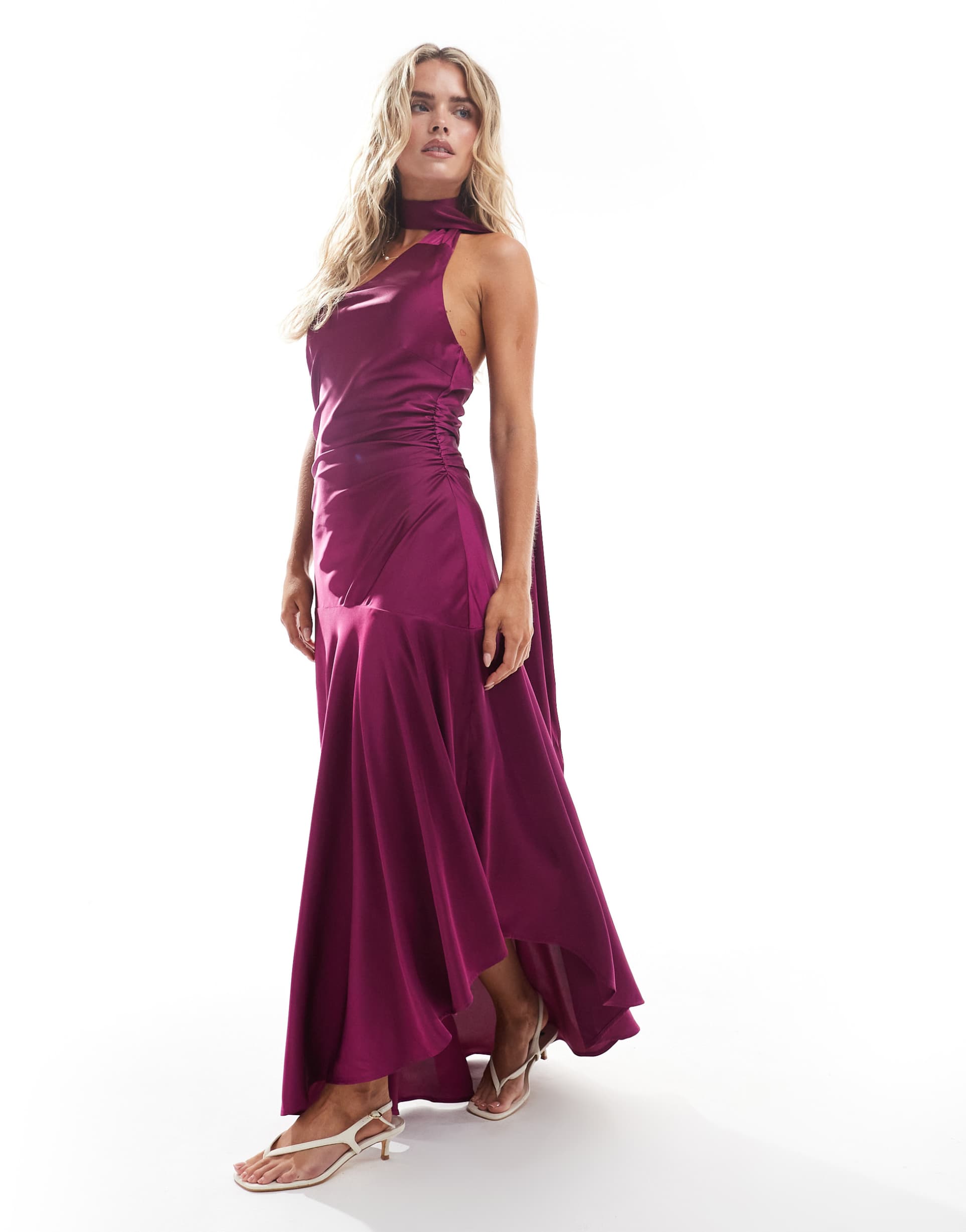 TFNC PETITE BRIDESMAIDS SATIN ASYMMETRIC MAXI DRESS WITH SCARF NECK IN PLUM
