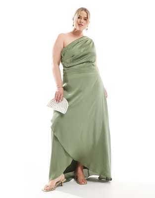 TFNC PLUS BRIDESMAID ONE SHOULDER SATIN MAXI DRESS WITH WRAP SKIRT IN DARK GREEN