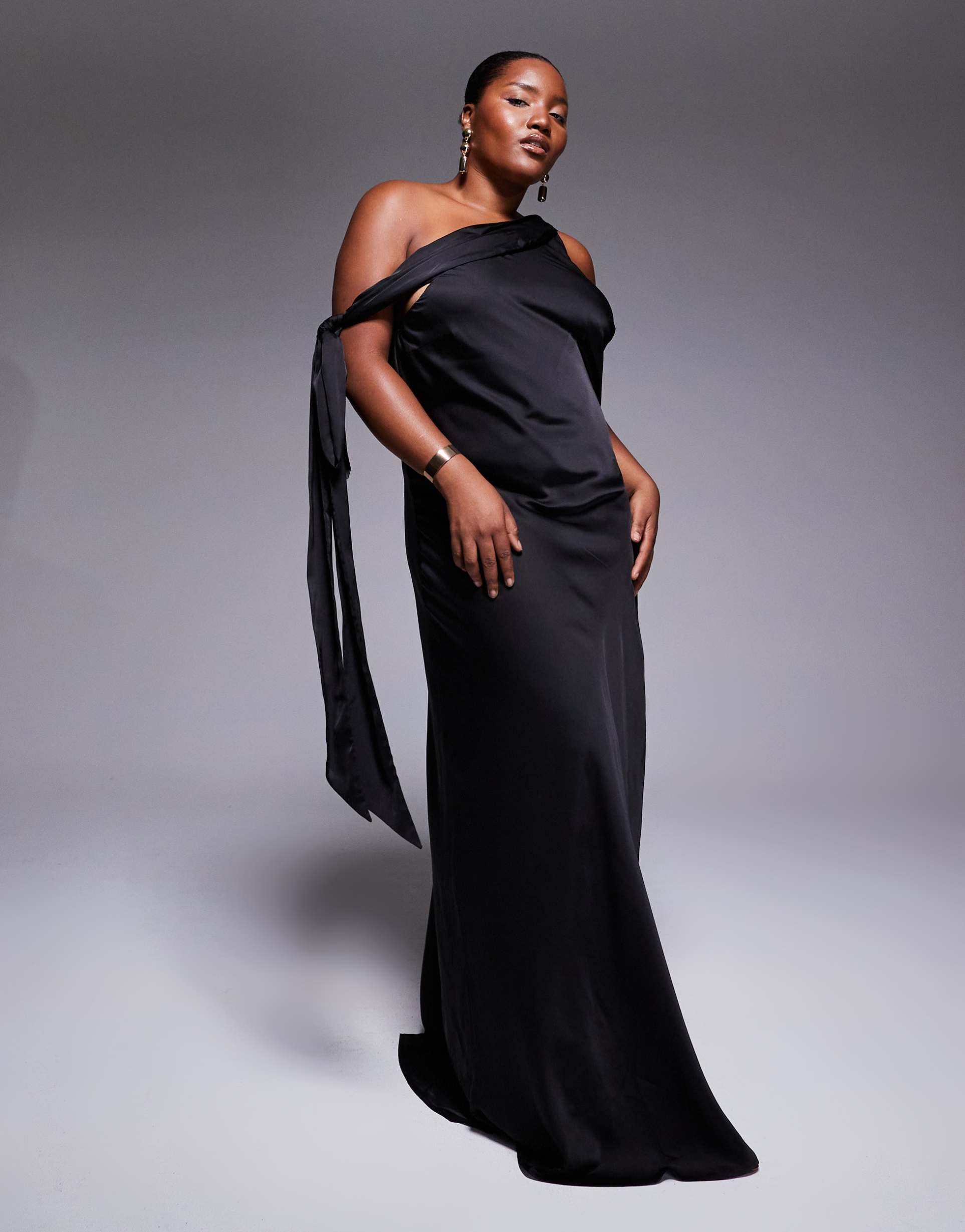 TFNC PLUS FALLEN SHOULDER MAXI DRESS WITH TIE DETAILS IN BLACK SATIN