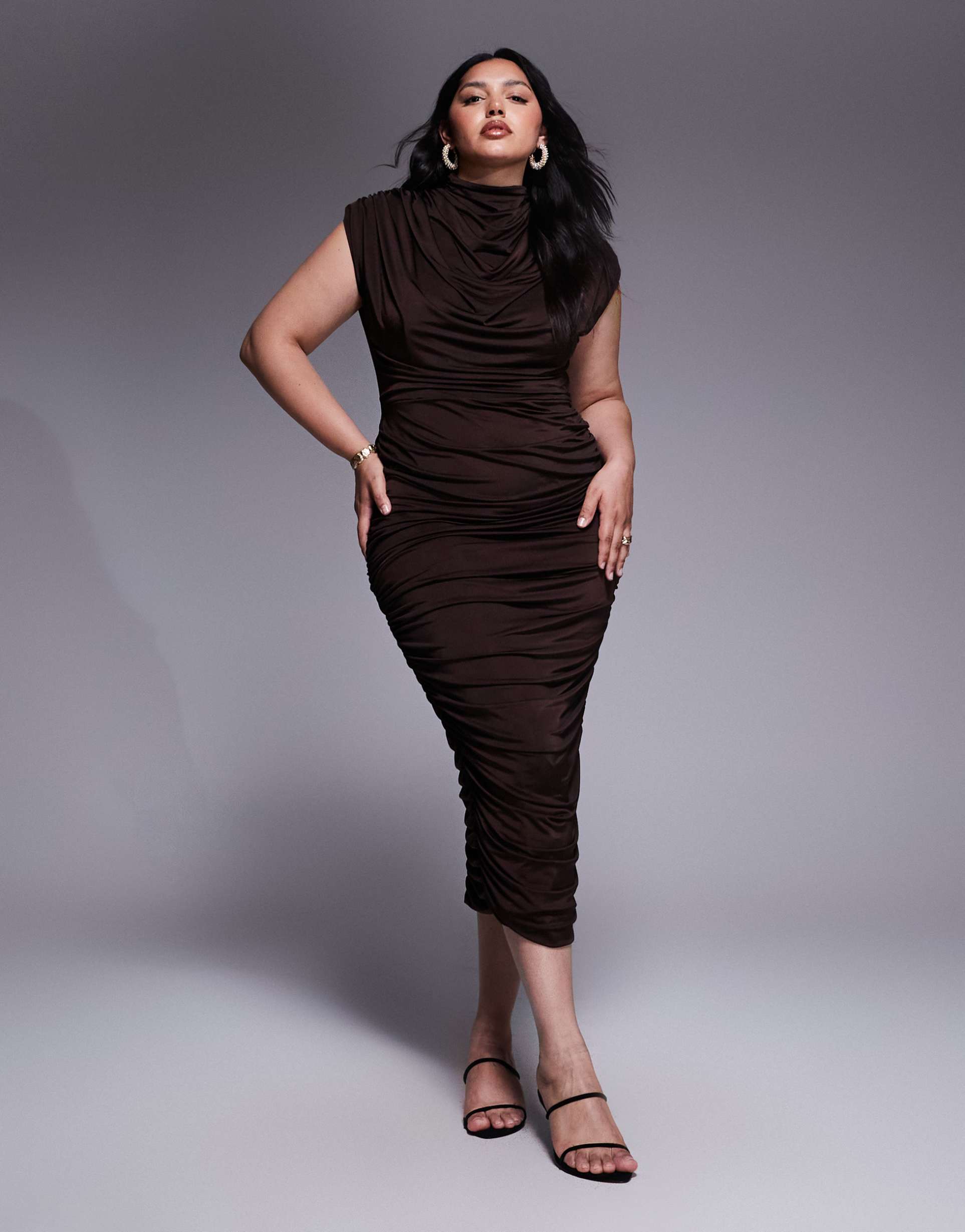Soft and stretchy jersey fabric sculpts a sophisticated silhouette with a high neckline and sleeveless design. The regular fit sheath style midi dress features elegant ruching all over for added texture and contouring. Its matte chocolate hue brings warmth and versatility, making it an excellent choice for autumn and winter evenings. Ideal for cocktail parties, date nights, and night outs, this TFNC Plus dress combines classic elegance with modern comfort for a timeless look.