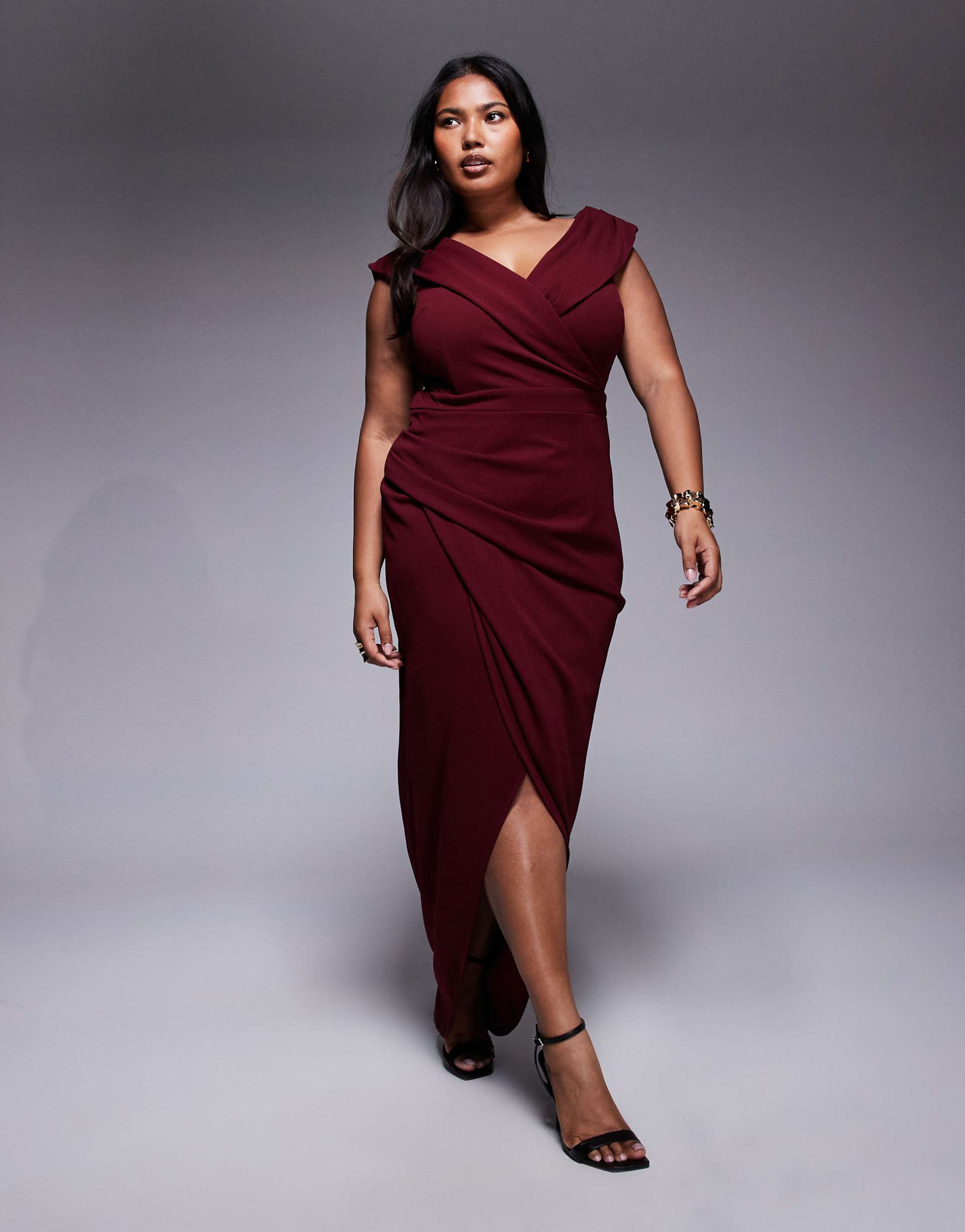 TFNC PLUS WRAP DETAIL BARDOT MIDAXI DRESS IN WINE