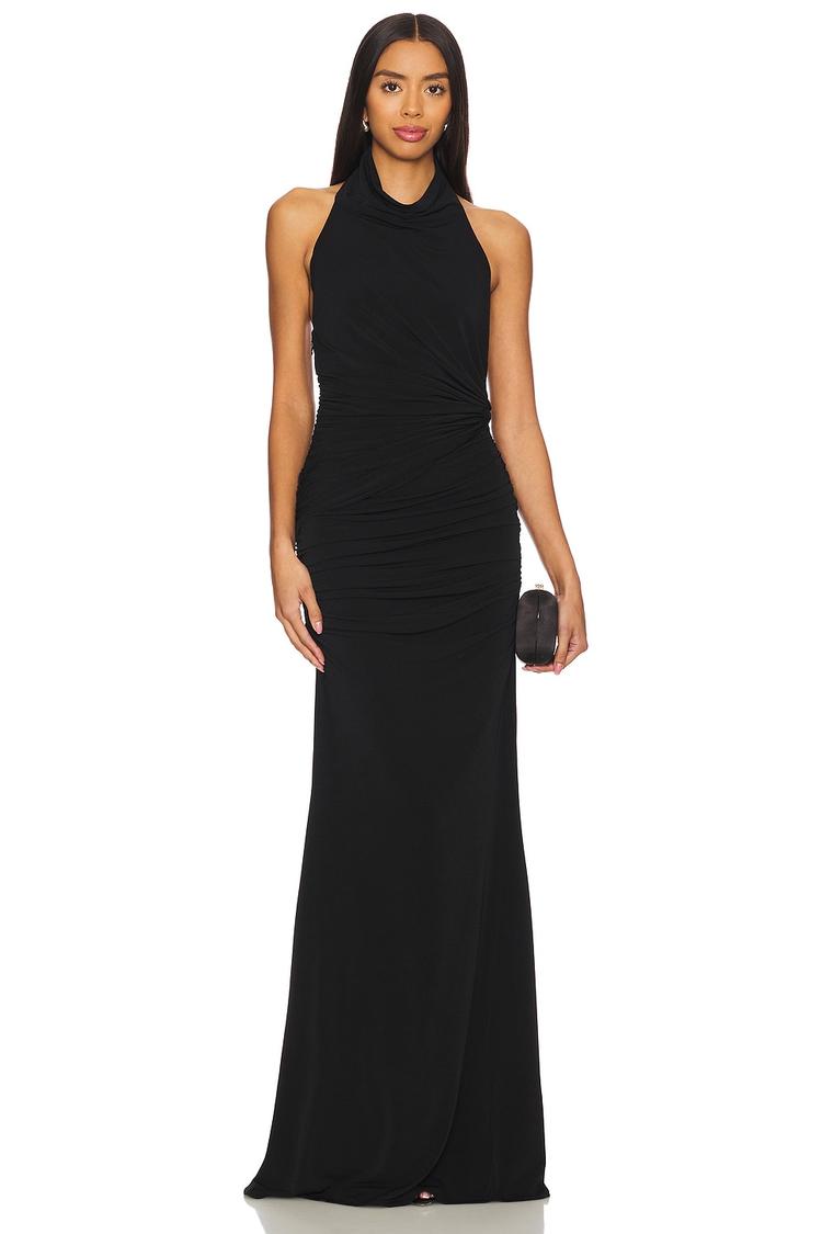 Sleek and sophisticated, this matte black column maxi features a fitted silhouette with ruched sides that enhance the figure. The halter neck with button closure and open back add an elegant, minimalist touch, while the lightweight jersey fabric ensures comfort and ease. Perfect for cocktail parties, date nights, or evening outings, its clean hemline and sleeveless design make it versatile for all seasons. Crafted from a polyester and elastane blend, it combines stretch and durability with refined style.