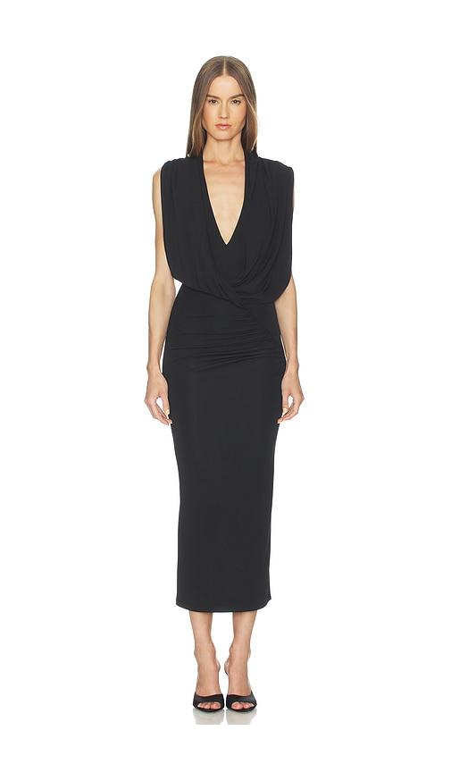 THE ANDAMANE ANNIE HOODED DRESS IN BLACK.