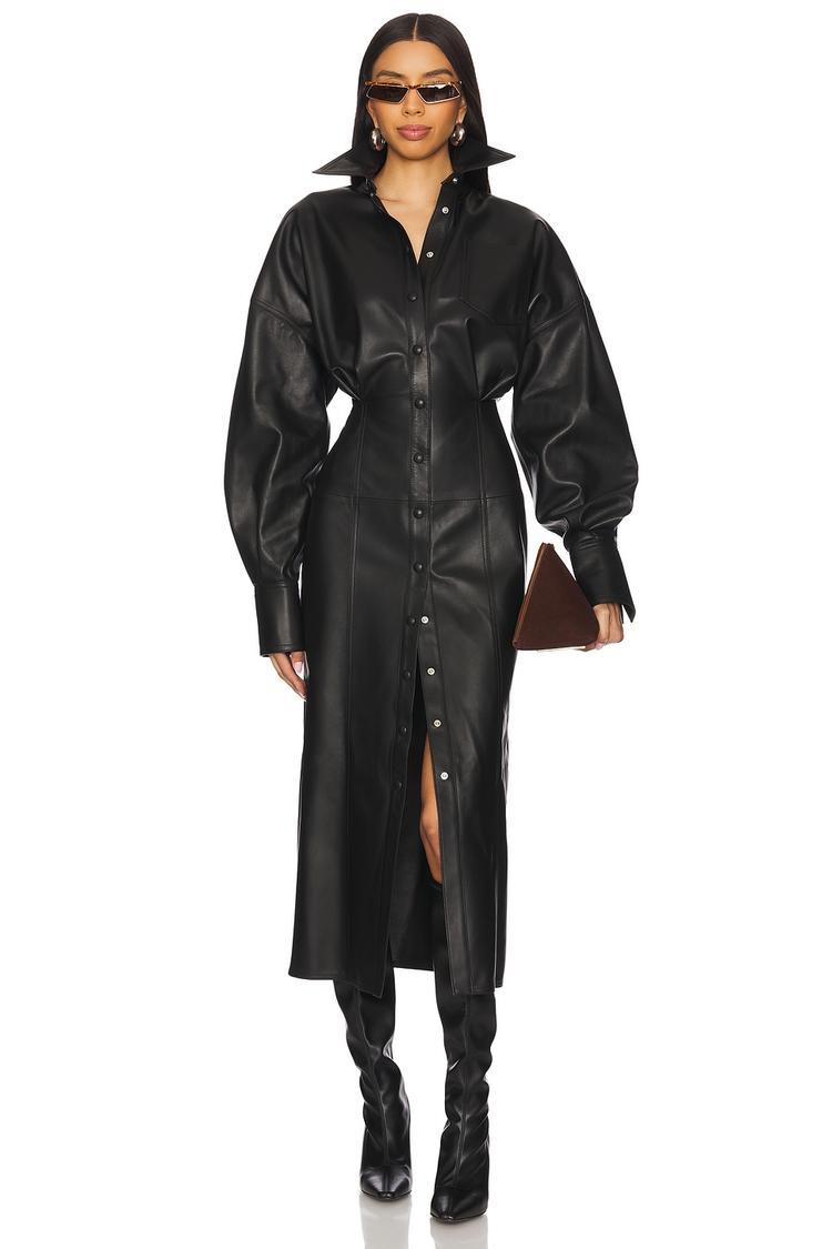 Heavyweight lambskin leather shapes a sleek, fitted midi shirt dress with a classic collar and long cuffed sleeves. The front snap and button closure add a modern edge, while the clean hemline enhances its streamlined silhouette. This sophisticated black leather dress is perfect for autumn and winter evenings, ideal for cocktail events, date nights, or stylish night outs. Its minimalist yet bold design exudes confidence and contemporary chic, making it a standout piece for a polished, fashion-forward wardrobe.