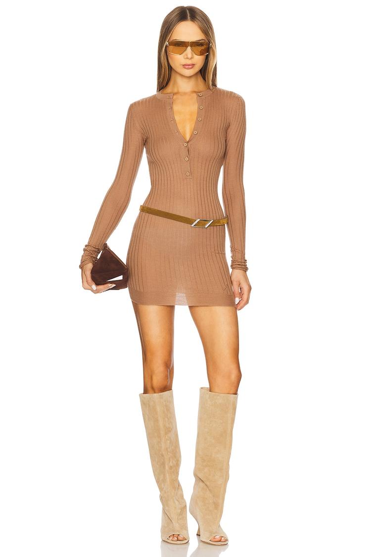 Lightweight ribbed knit fabric in a matte tan hue sculpts a sleek bodycon silhouette with a mini length. The long sleeves and V-neckline with partial front button closure add subtle, modern appeal, while the semi-sheer cashmere-silk blend lends an elegant touch of softness and delicate transparency. This sweater dress is perfect for casual outings, date nights, or stylish evenings out during autumn and winter months, combining comfort and sophistication effortlessly.