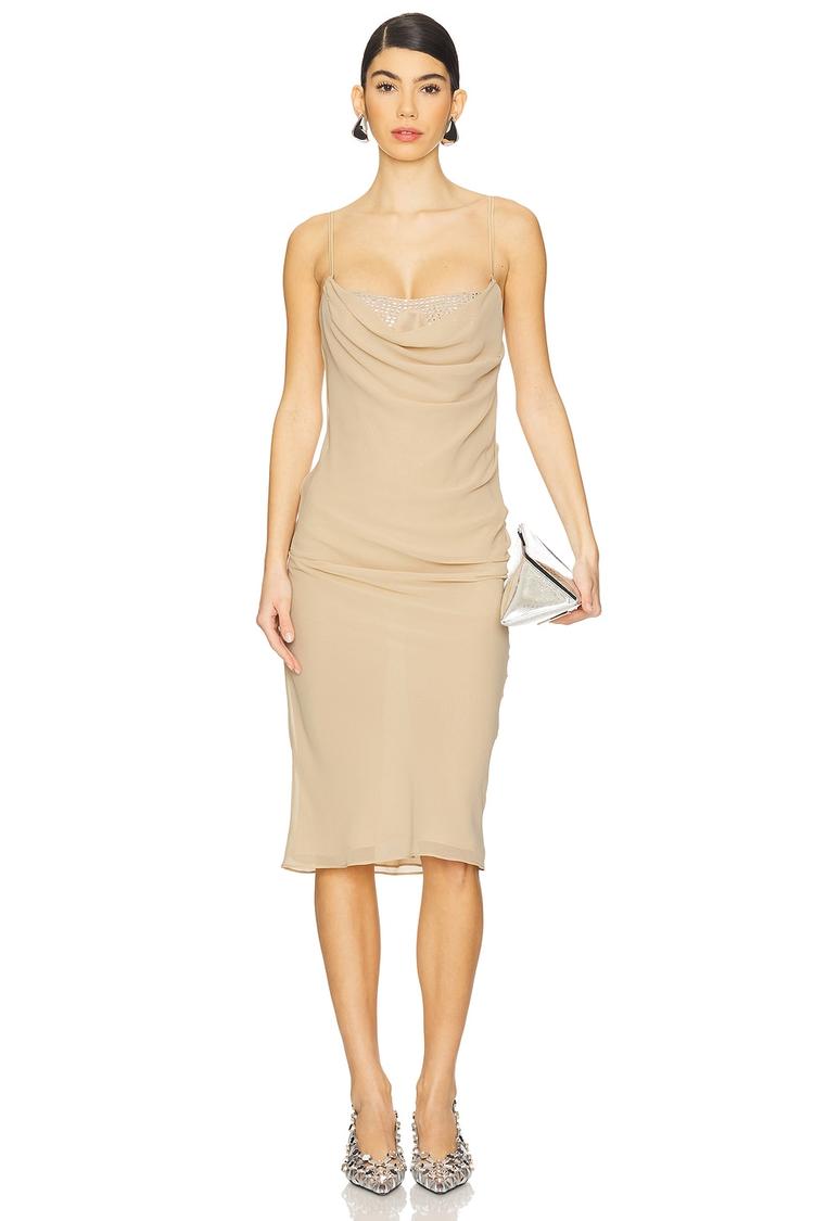 Soft beige georgette fabric with a figure-hugging slim fit defines this elegant slip dress. The midi length and sleeveless silhouette with adjustable shoulder straps and a draped neckline create a sophisticated profile. Rhinestone embellishments at the bust add a touch of sparkle, while draped detailing at the front and back enhances the modern, chic look. Ideal for cocktail parties, date nights, or upscale evening events, this Italian-made dress features a hidden back zip and hook-and-bar closure for a seamless finish.