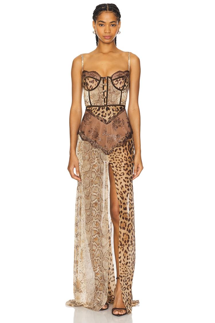 A striking combination of sheer chiffon and intricate lace with velvet contour detailing defines this fitted corset maxi dress. The straight neckline and strapless sleeve styling enhance its modern, sexy appeal, while the boned bodice adds structure and elegance. Featuring an all-over animal print with a dramatic thigh slit, this dress suits warm spring and summer evenings. Perfect for cocktail parties, formal events, or night outs, the adjustable straps and front button closure offer comfort and practicality. A bold statement piece crafted for confident, fashion-forward occasions.