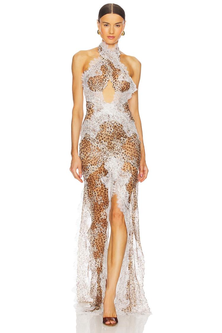 Sheer mesh and lace textures blend seamlessly in this elegant column maxi dress, featuring a halter neck and a fitted silhouette that flatters the figure. The animal print in warm beige and brown tones brings a bold yet sophisticated edge to the look, while the tie-back closure adds a delicate finishing touch. Perfect for cocktail parties, formal events, or a glamorous night out, this dress offers all-weather versatility with its partially lined design and clean hemline.