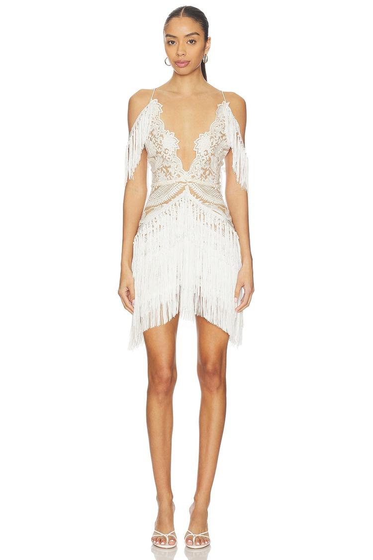 Delicate midweight lace and fringed trim define this white mini slip dress with a plunging V-neck and cold-shoulder sleeves, creating a sexy and modern silhouette. Its slim fit and asymmetric hemline add allure, while the concealed back zipper ensures a sleek finish. Perfect for spring and summer cocktail parties, night outs, or date nights, this elegant dress brings a touch of sophistication and movement with its fringe detailing. Crafted from polyester fabric, it offers both style and comfort for memorable evening occasions.