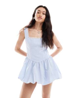 THE FROLIC EXCLUSIVE SQUARE NECK LACE TRIM MINI BUBBLE DRESS IN BLUE STRIPES
