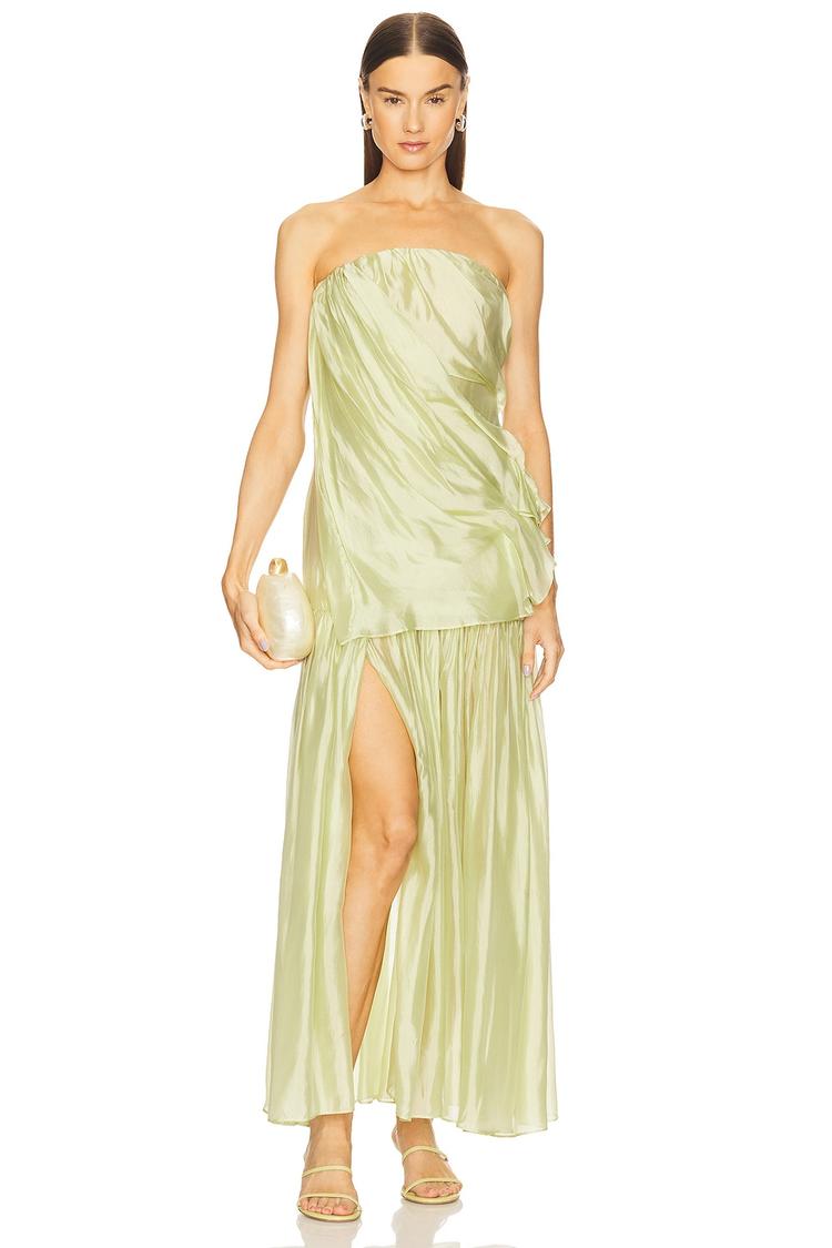 A shimmering light green column gown crafted from lightweight organza blends viscose and polyester for a delicate, airy feel. The strapless straight neckline and sleeveless design highlight the shoulders, while draping accents the front for elegant movement. Falling to a maxi length with a subtle slit hemline, this slim-fit silhouette is perfect for sophisticated occasions like cocktail parties, formal events, or wedding guests. Its minimalist yet refined style makes it a versatile choice for spring and summer celebrations.