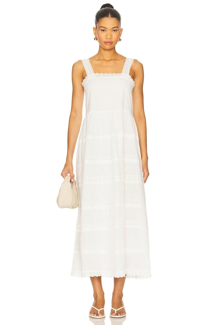 Soft white cotton with delicate lace trim crafts a breezy A-Line midi silhouette that drapes loosely for effortless comfort. The square neckline and wide straps frame the shoulders beautifully, while the clean hemline enhances its casual chic vibe. Designed for warm spring and summer days, this pull-on dress features a detachable slip lining for versatility. Ideal for brunches, relaxed vacations, or everyday wear, it embodies a laid-back bohemian spirit with a refined touch.