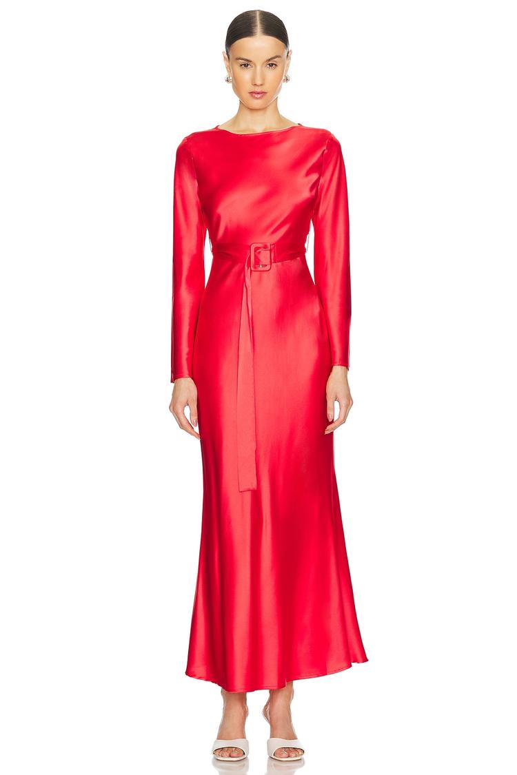 A radiant matte red silk maxi slip dress with a sleek, slim fit and long regular sleeves offers timeless sophistication. The round neckline and clean hemline enhance its elegant silhouette, complemented by a detachable belt at the waist for a refined touch. Perfect for cocktail parties, formal events, or intimate date nights, this unlined dress features pull-on styling for effortless wear. Crafted from luxurious silk, it exudes a polished yet comfortable vibe suitable for all seasons.
