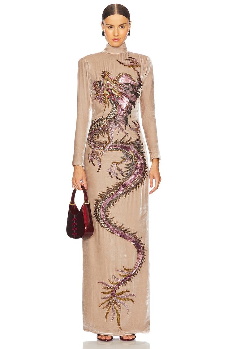 Delicate silk velvet shines with intricate sequin embellishments that trace a dramatic dragon motif on this column silhouette gown. The fitted maxi length and long sleeves balance the bold open back, secured with a partial hidden zipper and button closure. Padded shoulders add structure to the elegant round neckline, perfect for formal galas, cocktail events, or red carpet appearances. Crafted in luxurious silk velvet, this sophisticated gown offers a refined autumn and winter look that commands attention with its rich texture and metallic detail accents.