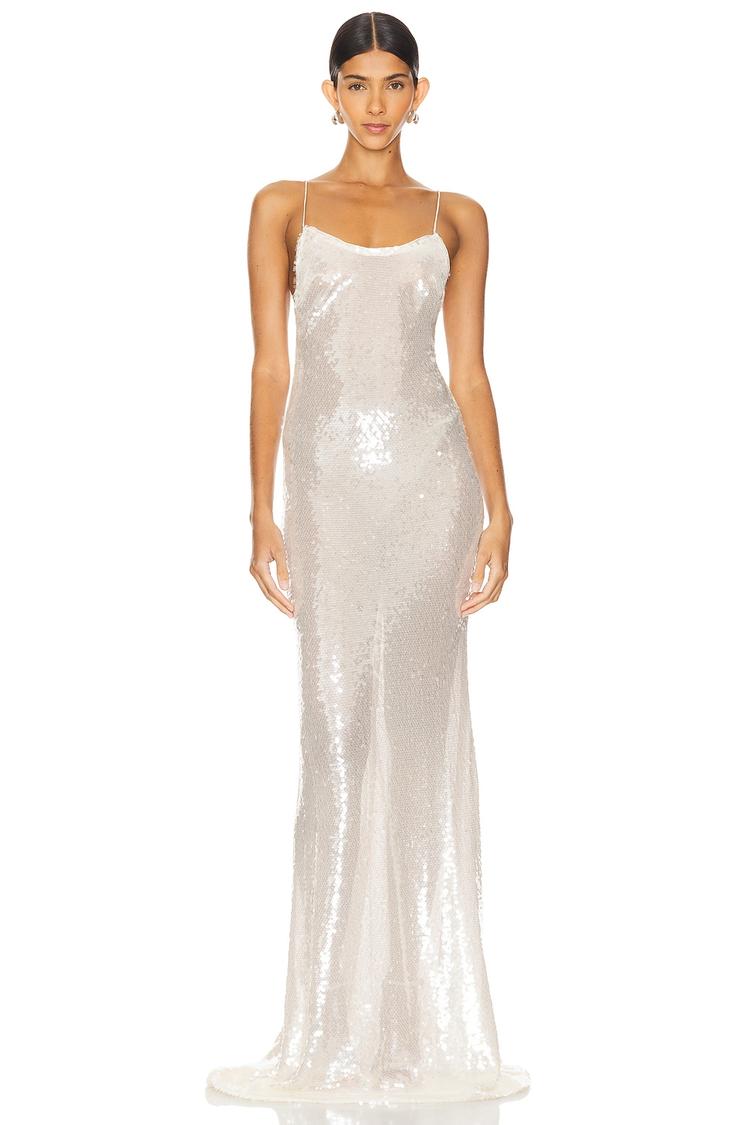 Shimmering sequin embellishments adorn this sleek off-white slip dress crafted from delicate mesh polyester fabric. The slim-fitting maxi silhouette features a straight neckline, spaghetti straps, and an alluring open back with a hidden zipper closure. Its clean hemline and all-over sparkle create a sophisticated, modern elegance perfect for cocktail events, formal evenings, or glamorous night outs. Lightweight and unlined, this dress offers a refined yet comfortable fit ideal for making a radiant statement at special occasions year-round.