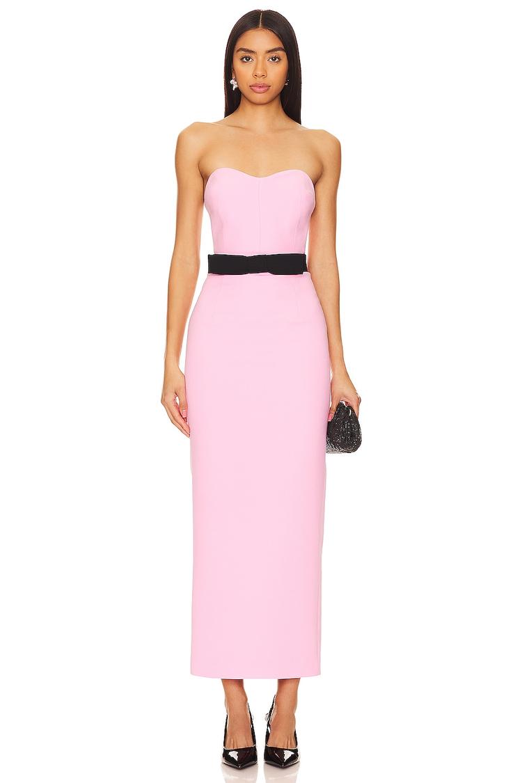 A matte pink crepe sheath silhouette with a flattering sweetheart neckline and strapless styling defines this midi dress. Featuring a detachable matte black belt with hook and eye closure, it enhances the waist for a sophisticated fit. The clean hemline and concealed back zipper closure add elegance and ease. Perfect for spring and summer cocktail parties, semi-formal events, or romantic date nights, this versatile dress pairs classic style with modern detailing for effortless charm.