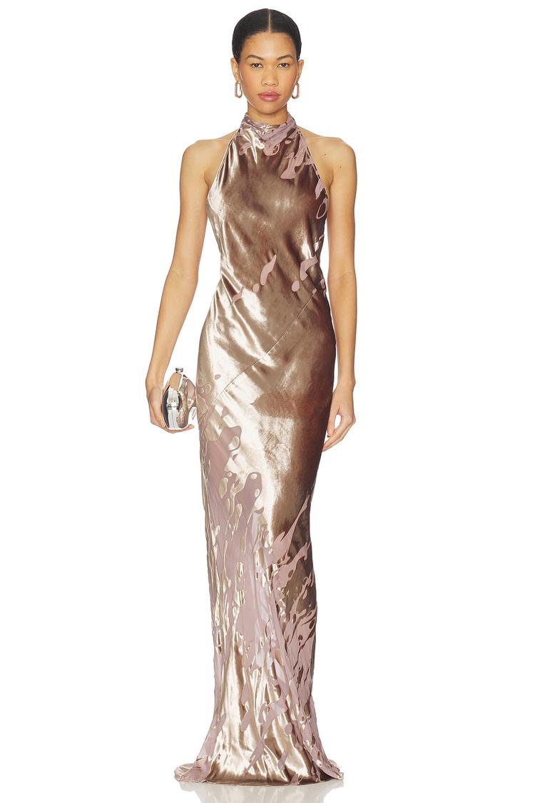 Shimmering in a metallic bronze satin finish, this halter-neck slip dress offers a sleek and close fit that gracefully skims the silhouette. The maxi length cascades effortlessly with a clean hemline, while the striking open back adds a bold, sophisticated touch. Crafted from a luxurious blend of rayon and silk, this gown suits formal occasions, cocktail events, and galas, making it a standout piece for those seeking minimalist elegance with a modern edge.