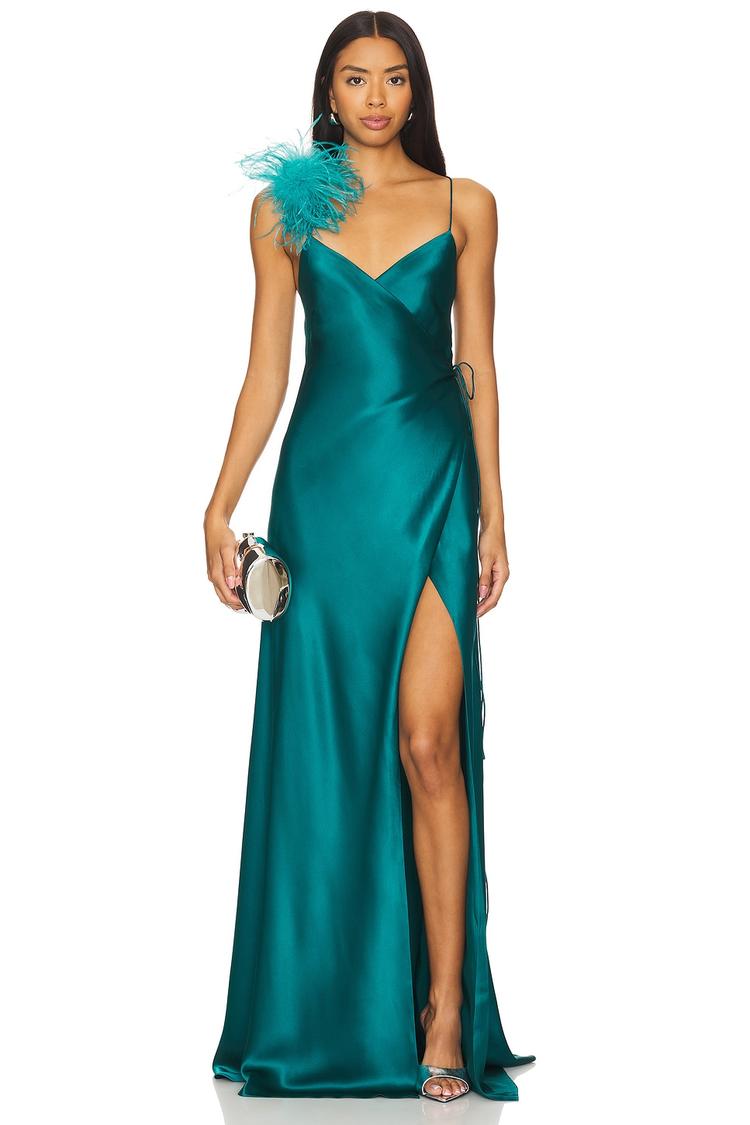 Satin teal silk wraps elegantly around the figure, featuring a slim fit and a flowing maxi length that skims the floor. The V-neckline and delicate spaghetti straps lead to a striking criss-cross back, while a dramatic side slit adds allure. A detachable ostrich feather trim on the shoulder introduces a playful, luxurious detail. Crafted from pure silk, this gown is perfect for formal events, cocktail parties, or wedding guest attire, offering sophistication and effortless glamour in one stunning piece.