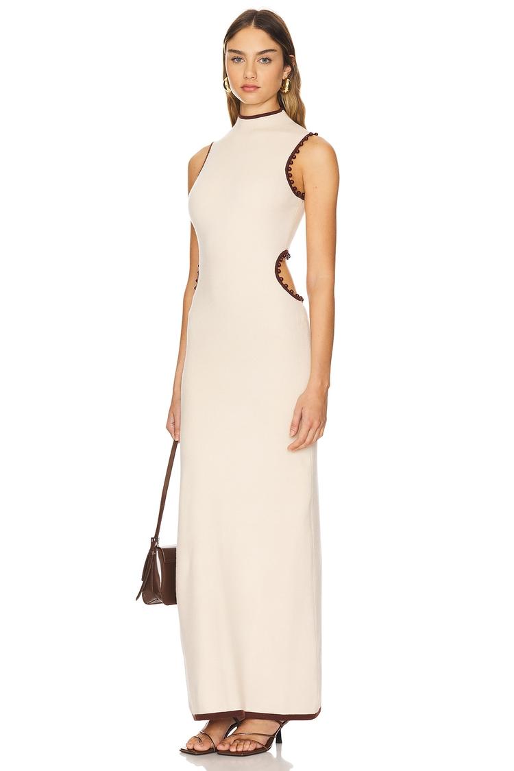 Sleek and sophisticated, this beige column dress features a high neckline and fitted silhouette that flatters the figure. Crafted from a midweight knit blend of viscose, polyester, and nylon, it offers comfortable stretch and pull-on ease. The sleeveless design with wide straps complements the elegant cut-out details at the sides and back, accented with delicate black bead embellishments. A subtle back vent adds movement to the clean midi hemline. Ideal for cocktail parties, date nights, and stylish evening events, this minimalist dress blends modern elegance with understated charm.