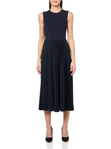 Matte navy hues define this fit and flare midi dress featuring a sleek knit crew neck bodice paired with a woven sunburst pleated skirt that adds elegant movement. Sleeveless styling and a covered back create a clean, polished silhouette perfect for workwear, business casual events, or sophisticated brunches. The classic minimalist design blends comfort with timeless style, making it versatile enough for date nights or cocktail occasions.