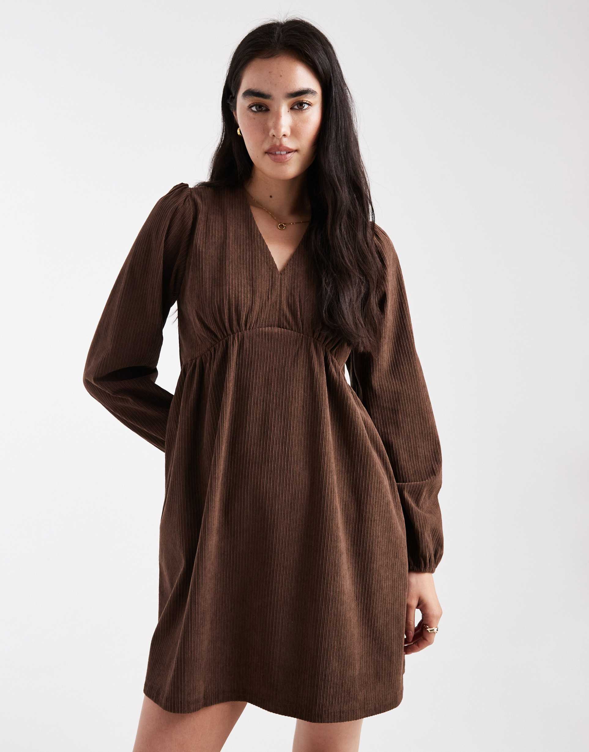 THREADBARE CORDUROY LONG SLEEVE MINI DRESS IN CHOCOLATE BROWN