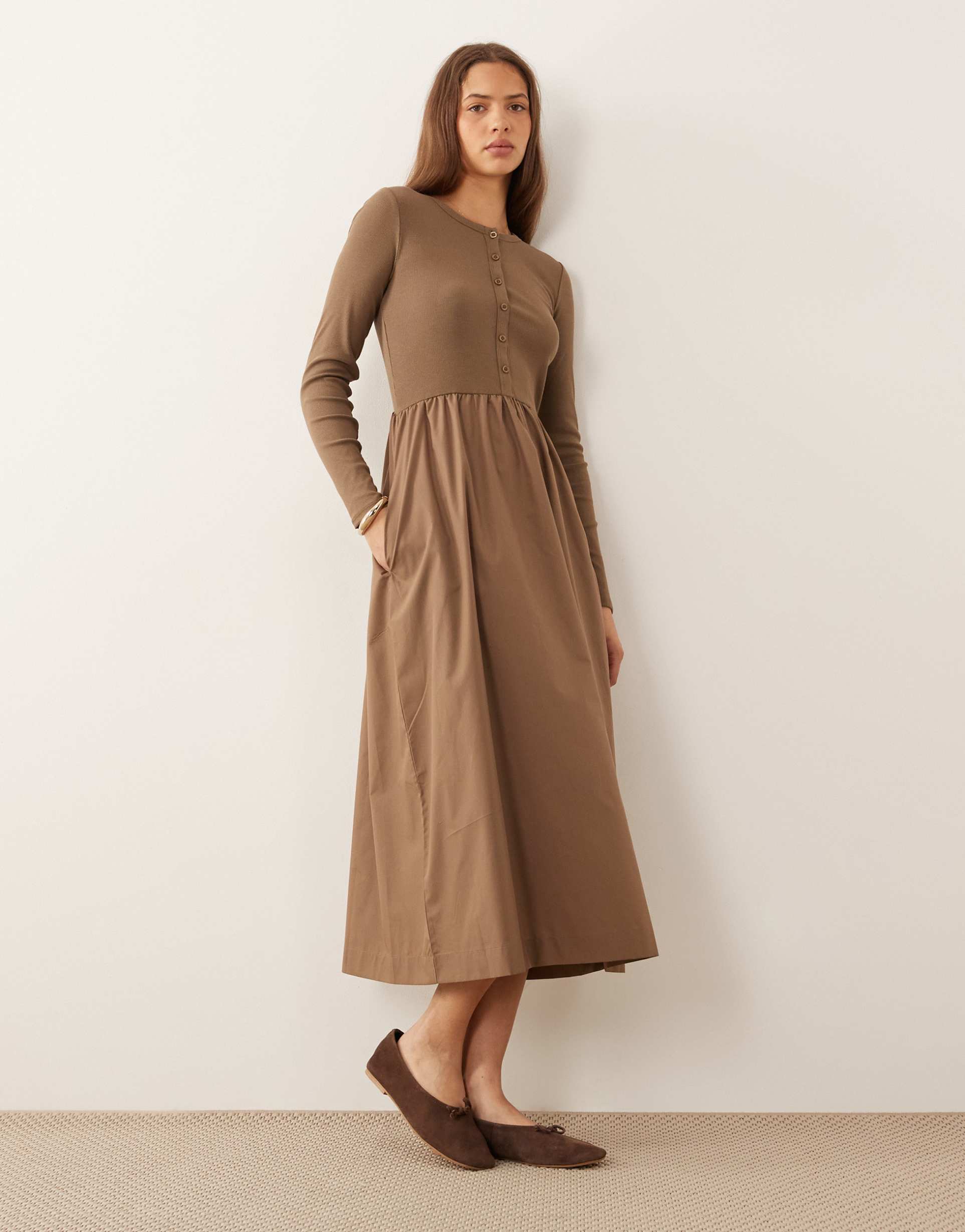 THREADBARE JERSEY POPLIN MIX MIDI DRESS WITH BUTTON UP TOP IN MOCHA