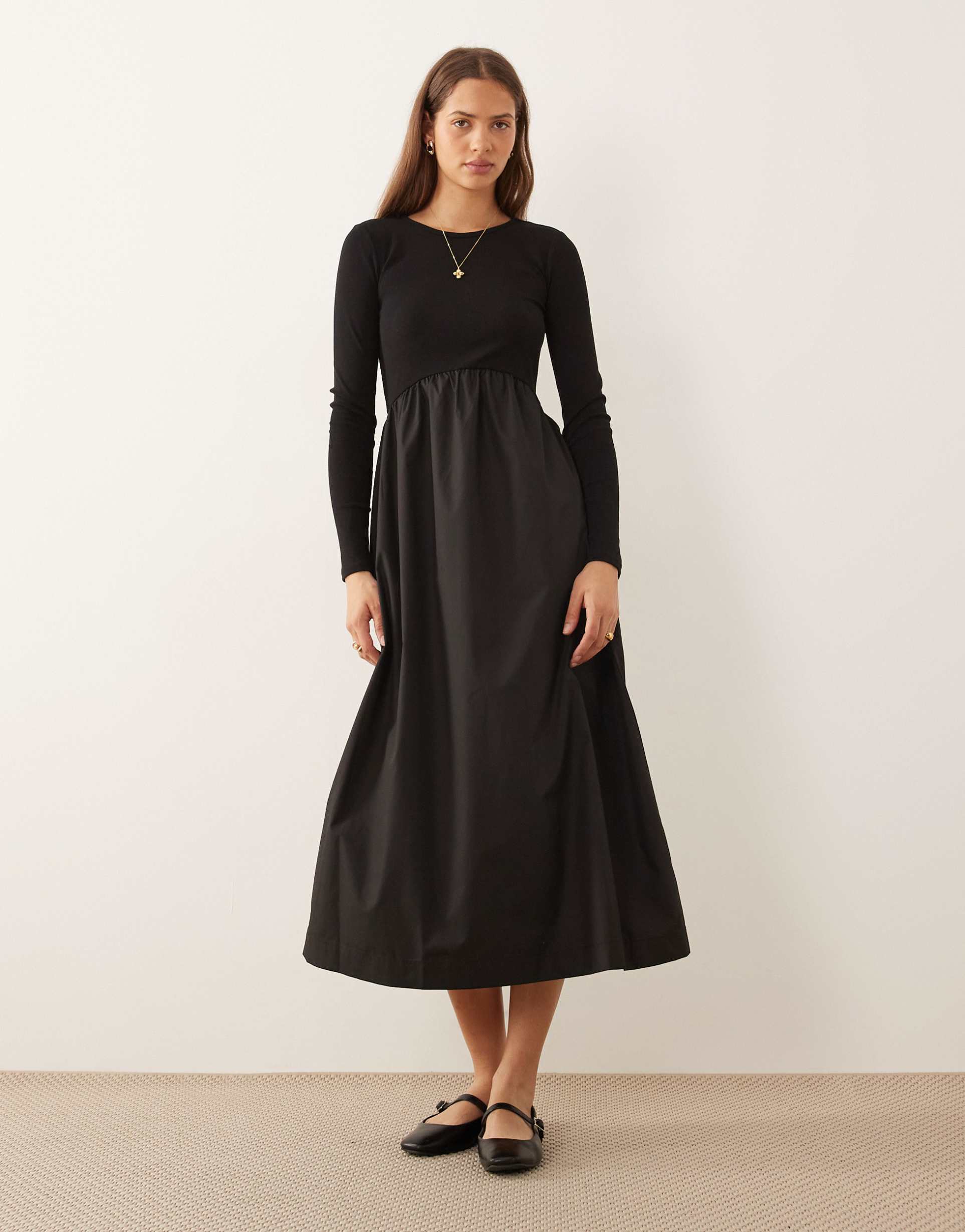 THREADBARE LONG SLEEVE JERSEY POPLIN MIX MIDI DRESS IN BLACK
