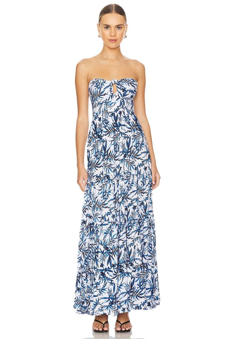 Soft, lightweight polyester in a botanical print flows gracefully into a relaxed, A-line maxi silhouette with a ruffled hem. The strapless straight neckline and smocked back panel provide a comfortable, slip-on fit, while the bust tie closure adds a delicate touch. Ideal for warm spring and summer days, this dress transitions effortlessly from beach vacations to casual brunches and date nights with its easygoing bohemian charm.