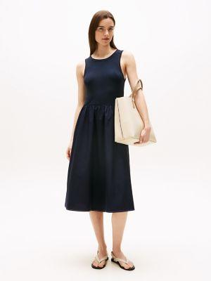 Softly ribbed fabric shapes a sleeveless midi dress with a flattering elastic waist that creates a comfortable regular fit. The classic round neckline and clean hemline underscore its minimalist charm, while signature ribbon accents at the collar and armholes add a touch of Tommy Hilfiger’s iconic style. Crafted from a viscose-elastane blend, this summer-ready dress offers fluid movement and breathability, perfect for casual brunches, everyday errands, or relaxed workwear settings. Functional side pockets enhance practicality, making it a versatile and stylish addition to any warm-weather wardrobe.