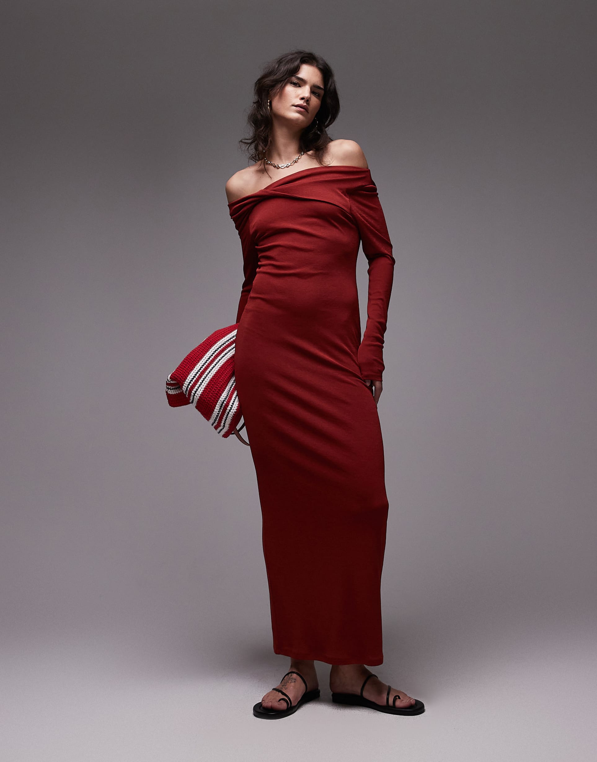 Soft and stretchy jersey fabric shapes this rust red maxi dress into a slim, column silhouette perfect for evenings. The off-shoulder bardot neckline with a twist detail adds a modern, elegant touch, while long sleeves offer coverage and balance. Clean hemlines and front draping accentuate the flattering fit, making it ideal for cocktail parties, night outs, or romantic date nights. This versatile piece marries comfort and sophistication, suitable for autumn and winter wardrobes seeking a sleek, sexy style.
