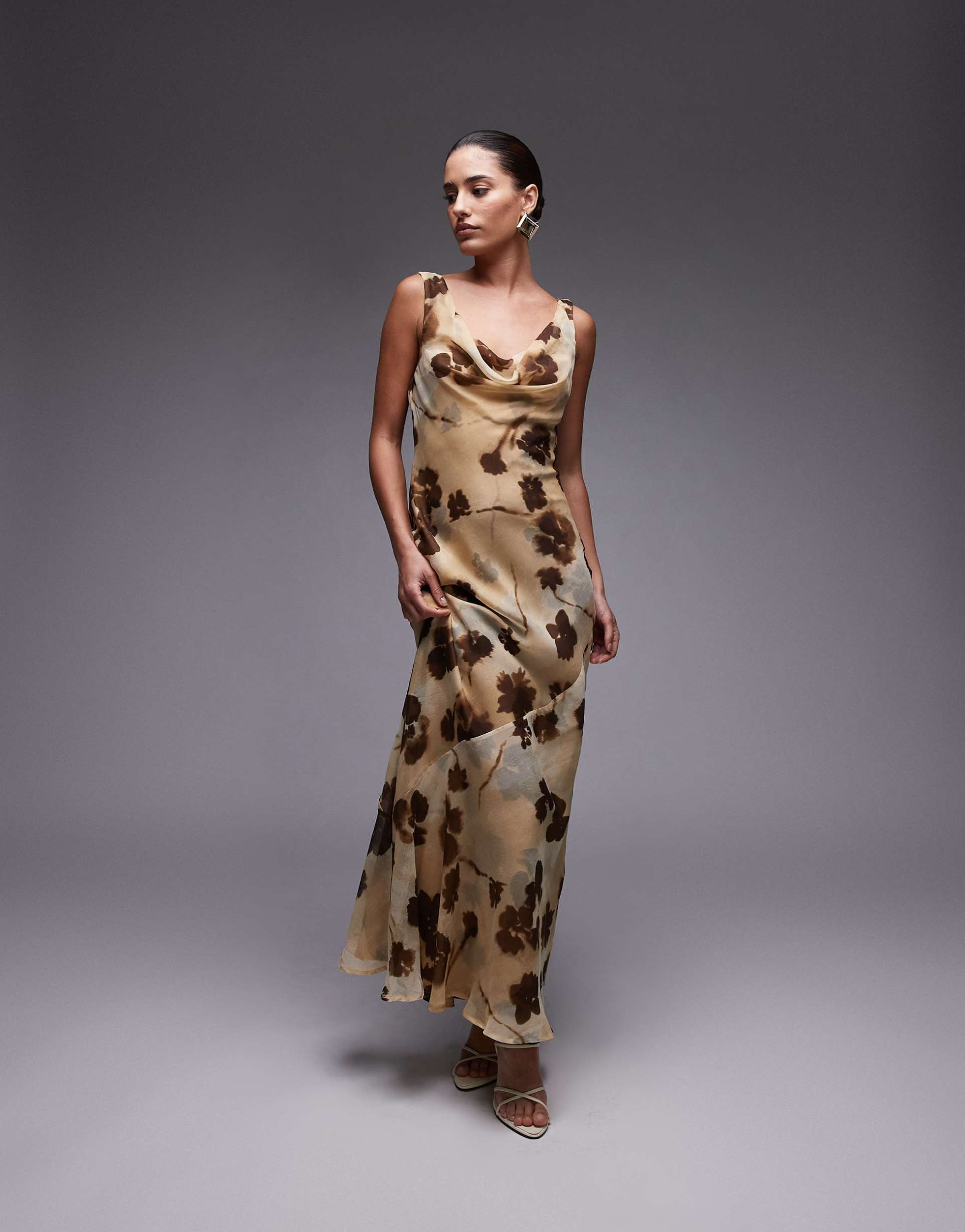 Soft chiffon fabric and a flowing maxi silhouette define this elegant slip dress, featuring a delicate all-over floral print in brown and black on a matte beige base. The cowl neckline and back add a touch of classic sophistication, complemented by fixed straps and a regular fit that skims the body gracefully. Sleeveless and perfect for spring and summer, this dress suits cocktail parties, date nights, and evening outings with ease. The sheer texture lends an ethereal quality, making it a refined choice for versatile warm-weather occasions.