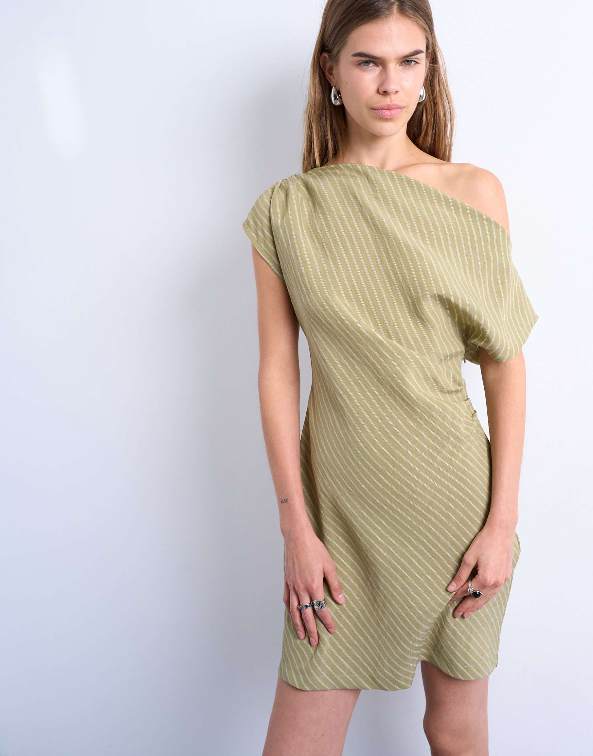 TOPSHOP CINCHED WAIST GROWN ON NECK MINI DRESS IN GREEN STRIPES