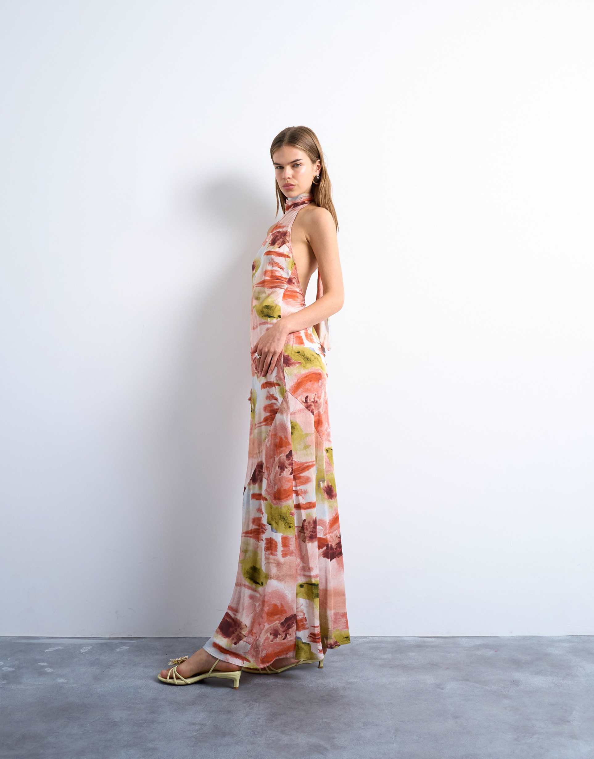 Bold abstract floral patterns adorn this high-neck slip dress crafted from breathable viscose fabric. The regular fit and midi length create a flattering silhouette, enhanced by the sleeveless, strapless styling and striking open back. Perfect for spring and summer, it transitions seamlessly from brunches to cocktail evenings and date nights, offering a modern, elegant look with clean hemline details and a comfortable fit.