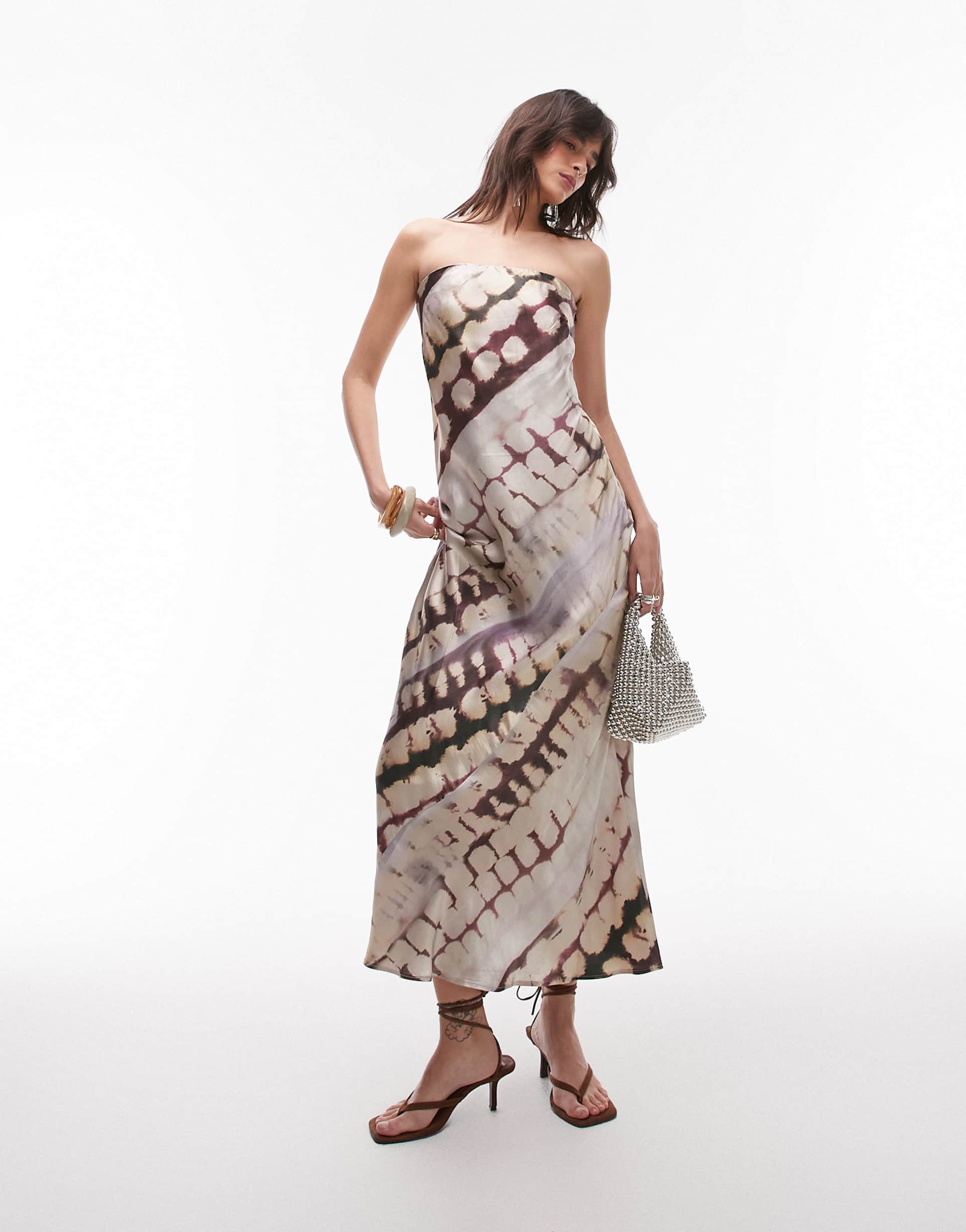 TOPSHOP SATIN BANDEAU SLIP MAXI DRESS IN ABSTRACT ANIMAL PRINT