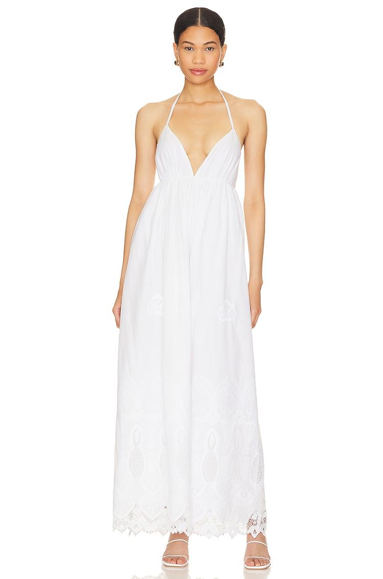 Soft cotton voile fabric combined with delicate guipure lace trim creates an airy, romantic maxi silhouette. The plunge neckline and tie-back halterneck emphasize a breezy, flowy fit perfect for warm spring and summer days. This white slip dress features a scalloped hemline that adds subtle texture and charm. Fully lined for comfort with a hidden back zipper, it suits casual brunches, beach vacations, or relaxed date nights with ease.