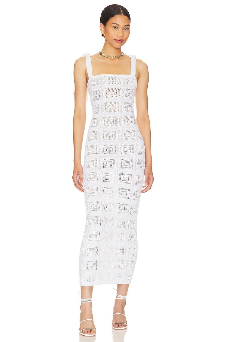 Light and breathable cotton knit with a geometric pattern creates a sleek midi silhouette that hugs the body. The square neckline and wide adjustable tie shoulder straps complement the open back cut-out, offering a flirty yet modern vibe. Its fitted sheath shape and sheer midweight fabric make it ideal for warm spring and summer occasions. This versatile piece transitions effortlessly from brunch to date night or an evening out, combining comfort with statement style.