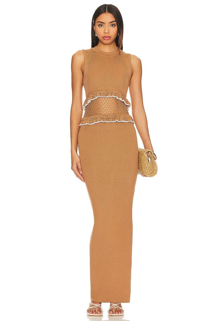 Say hello to the Tularosa Keiran Maxi Dress in Dark Camel. Featuring crochet knit fabric and a ruffle waist, it boasts faux two-piece styling for a flirty, cozy knit look. Sleeveless drama meets neutral color allure in this must-have maxi dress.