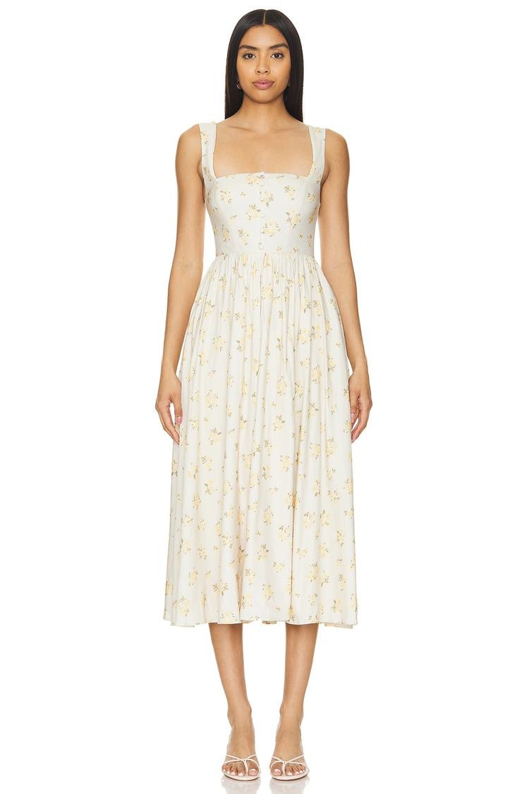 Soft linen and rayon blend fabric with a hint of elastane forms a breezy yet fitted midi dress perfect for warm seasons. Featuring a classic A-line silhouette, the dress is defined by wide straps and a flattering square neckline. Its midi length and clean hemline offer timeless elegance, while side seam pockets add practical charm. The delicate all-over yellow floral print on an off-white base enhances its romantic and classic style, making it ideal for casual outings, brunches, date nights, or vacation wear.