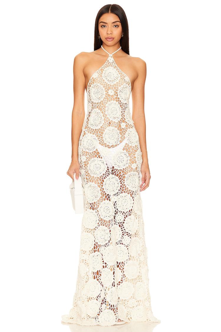 Delicate floral crochet in off-white cotton creates an effortlessly romantic and bohemian maxi slip dress. The slim fit and halter neck with tie-back closure highlight the shoulders and back, while the sleeveless design keeps it cool for spring and summer evenings. This sheer, unlined dress pairs beautifully with minimal accessories for cocktail parties, date nights, or stylish nights out. The intricate all-over floral pattern and clean hem add a sophisticated yet trendy touch to your warm-weather wardrobe.