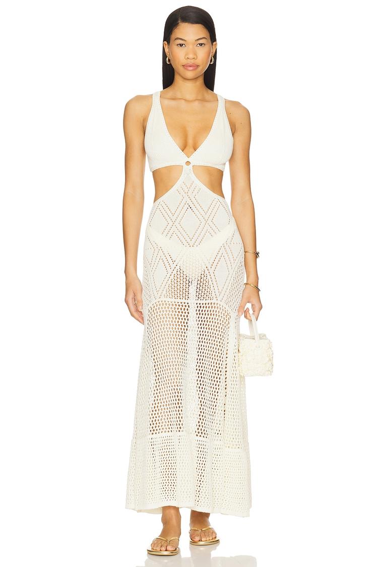 An airy, open crochet design in a creamy hue lends this maxi slip dress a breezy bohemian vibe. The slim fit elegantly skims the body, while cut-out accents on the front and back add a playful touch. Wide straps and a plunging V-neckline create a flattering silhouette perfect for warm-weather days. Crafted from midweight cotton crochet fabric, this dress offers breathable comfort ideal for beach getaways, casual brunches, or romantic date nights. The elastic waistband ensures easy pull-on styling, combining effortless wearability with standout style.