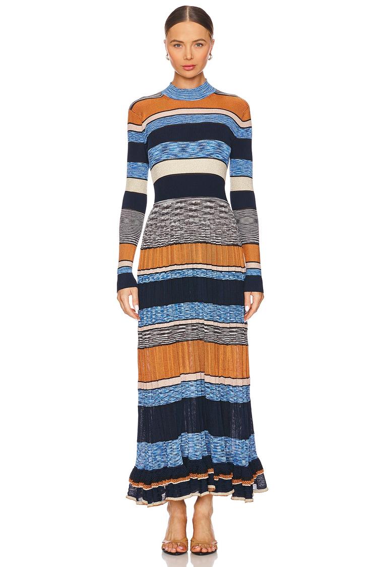 A heavyweight knit fabric forms a fitted column silhouette with long sleeves and a chic mock neck, dressed in bold horizontal stripes of navy, orange, light blue, gray, and white. The maxi-length hem features tiered ruffles that add a playful, bohemian touch to this elegant yet casual dress. Ideal for autumn and winter wear, it suits brunches, casual outings, and date nights with its comfortable pull-on slip-on styling and refined color palette. This Evangeline Dress by Ulla Johnson balances cozy warmth with sophisticated style for versatile seasonal dressing.