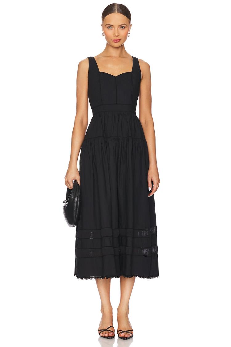 A timeless black midi dress crafted from midweight cotton poplin with a fitted, quilted bodice and square neckline. Sleeveless with wide straps and a concealed side zipper, it features layered, pleated hem details and practical pockets for comfort and style. Its classic fit-and-flare silhouette makes it perfect for brunches, date nights, and cocktail events, blending elegance with casual chic vibes. Partially lined for ease and crafted with quality fabrics, this dress balances sophistication and everyday wearability effortlessly.
