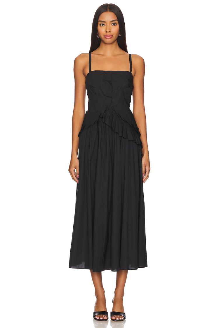 Soft cotton fabric shapes this elegant midi dress with a square neckline and delicate spaghetti straps. The A-line silhouette features ruffle accents cascading from the bodice to the skirt, adding romantic texture while maintaining a clean hemline. Its concealed back zipper ensures a smooth finish, perfect for spring through autumn occasions like brunch, cocktail evenings, or date nights. The matte black hue makes it a versatile and timeless piece that combines classic charm with subtle, feminine detailing for effortless style.