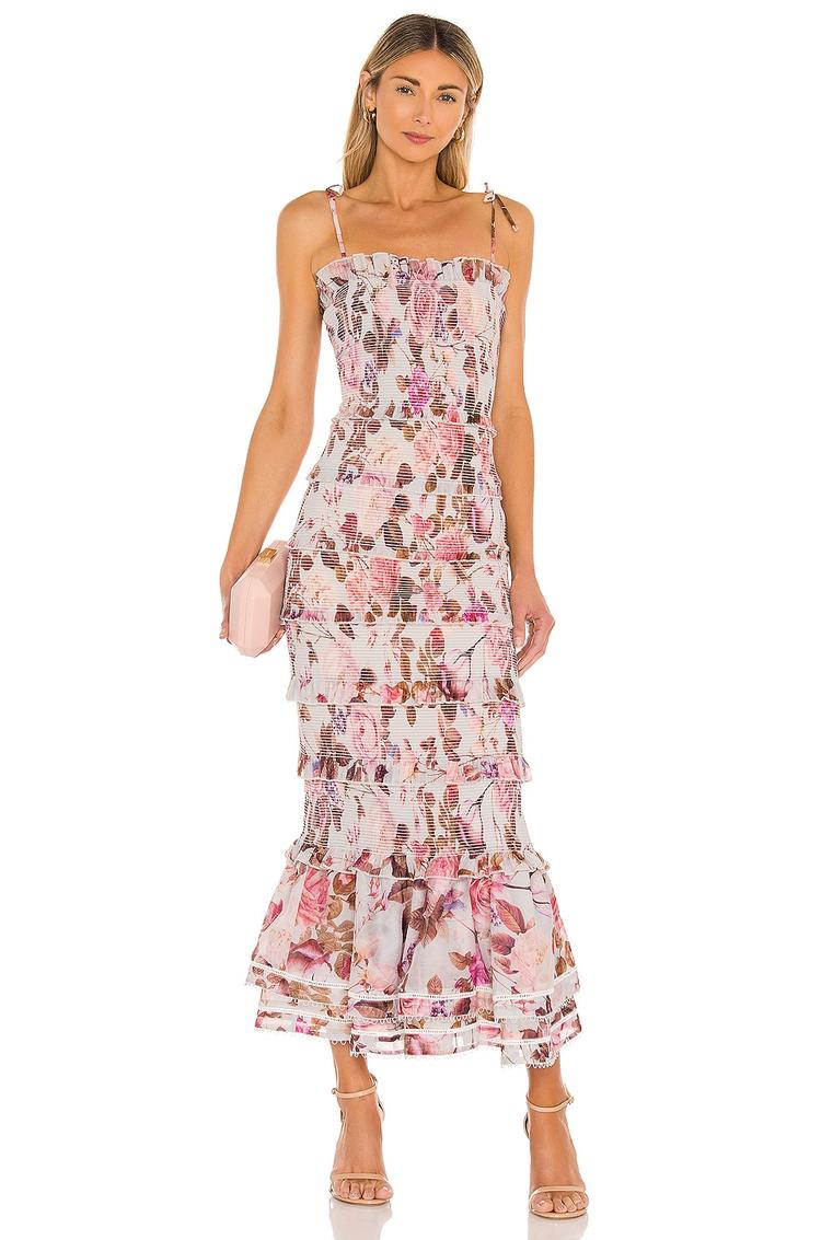 Soft matte off-white fabric adorned with a dusty rose and taupe floral print creates a romantic and bohemian slip dress. The slim fit and straight neckline are complemented by delicate spaghetti straps with adjustable ties, enhancing comfort and style. Smocked detailing on the bodice and ruffled tiers on the midi-length skirt add feminine texture and movement. Crafted from polyester with a rayon lining, this fully lined dress offers a lightweight feel perfect for spring and summer occasions such as brunch, date nights, or cocktail events.