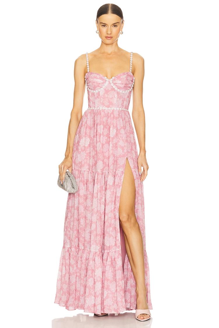 Soft pink chiffon with delicate floral patterns and white lace trim creates a romantic silhouette in this fitted slip dress. Featuring adjustable spaghetti straps, a sweetheart neckline, and a boned bodice with ruched underwire cups, this maxi-length gown is completed with a high side slit for graceful movement. The lace-up tie back and hidden zipper ensure a perfect fit. Ideal for spring and summer occasions, it suits cocktail parties, date nights, and wedding guest attire with effortless elegance.