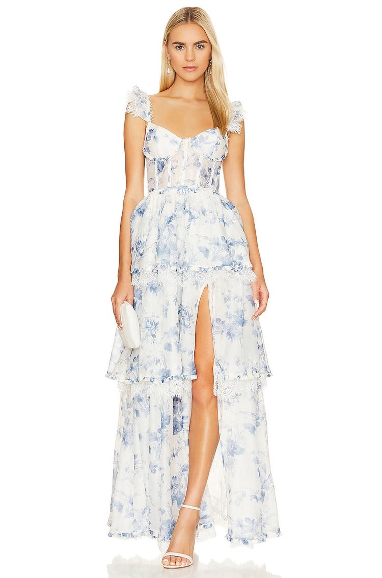 Delicate voile fabric with eyelash lace trim forms this romantic empire waist gown, featuring a boned bodice and flutter sleeves that enhance its fitted silhouette. The soft white base is adorned with a light blue floral print layered in ruffled tiers that cascade to a maxi length hemline. A hidden back zipper combined with a lace-up tie-back closure ensures a perfect fit. This lightweight dress is an elegant choice for formal events, cocktail parties, or wedding guest attire during spring and summer seasons.
