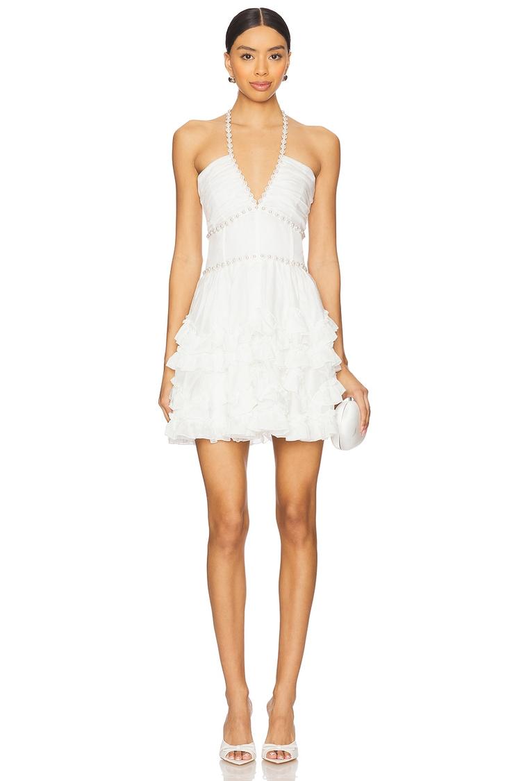 Delicate halterneck ties and a lace-up back with pearl and rhinestone embellishments elevate this chic babydoll mini dress. Crafted from a lightweight blend of linen, nylon, and lyocell, its soft texture complements the ruffled hemline for a flirty, loose fit. The sleeveless design and mini length make it perfect for warm spring and summer days. Ideal for date nights, brunch outings, or lively nights out, this dress combines modern sophistication with subtle glamour for versatile style.