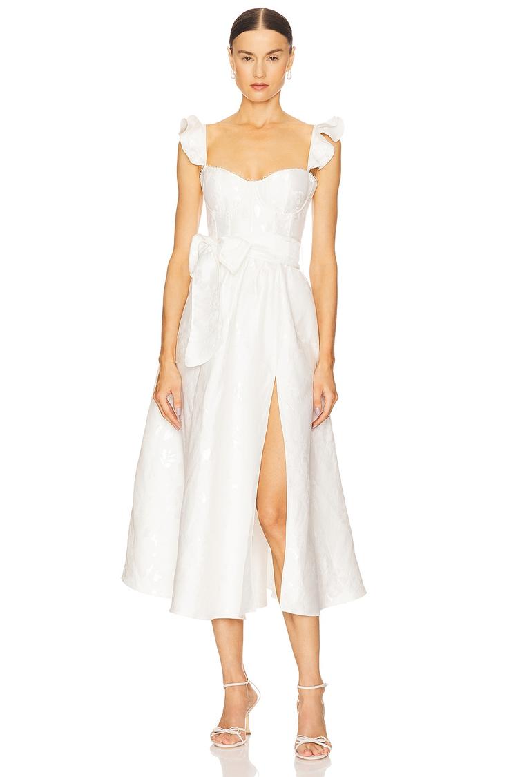 Soft satin jacquard fabric shapes a fitted corset dress with a flattering sweetheart neckline and wide straps accented by delicate ruffles on the shoulders. This elegant midi-length silhouette features a side slit and a detachable waist tie for adjustable style and comfort. Lightly padded underwire cups and a boned bodice create a structured yet feminine fit, complemented by a smocked back panel and exposed zipper closure. Ideal for spring and summer brunches, date nights, or cocktail events, this sophisticated dress effortlessly blends classic charm with modern design.
