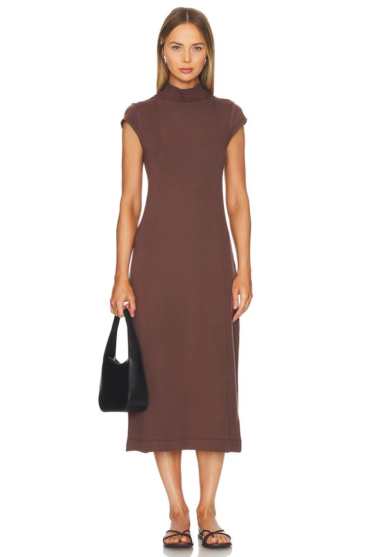 Soft and sleek, this brown midi sheath dress features a minimalist silhouette with a fitted cut that flatters the figure. The mock neck and cap sleeves add subtle sophistication, while the clean hemline enhances its classic appeal. Crafted from a comfortable blend of viscose, polyester, and elastane, it offers easy pull-on styling perfect for all-weather wear. Ideal for casual days, business casual settings, or workwear, this versatile dress combines understated elegance with practical comfort for a polished look.