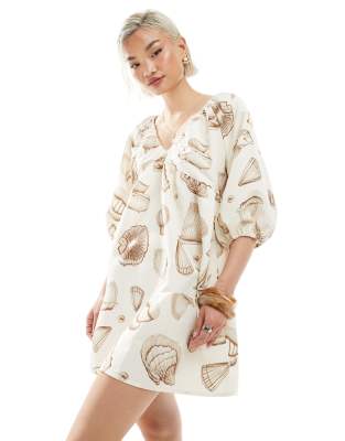 VERO MODA BLOUSON SLEEVE MINI DRESS IN NEUTRAL SHELL PRINT